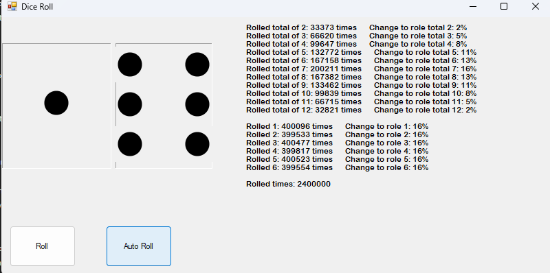 Dice RollDate 12/11/25 In this program you can roll a dice and see the probabilities of each roll and other data.