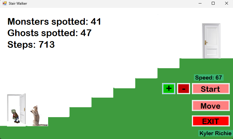 Stair WalkerDate 12/11/25 In this program you can play a game where you move a character up and down stairs and see ghosts and monsters.